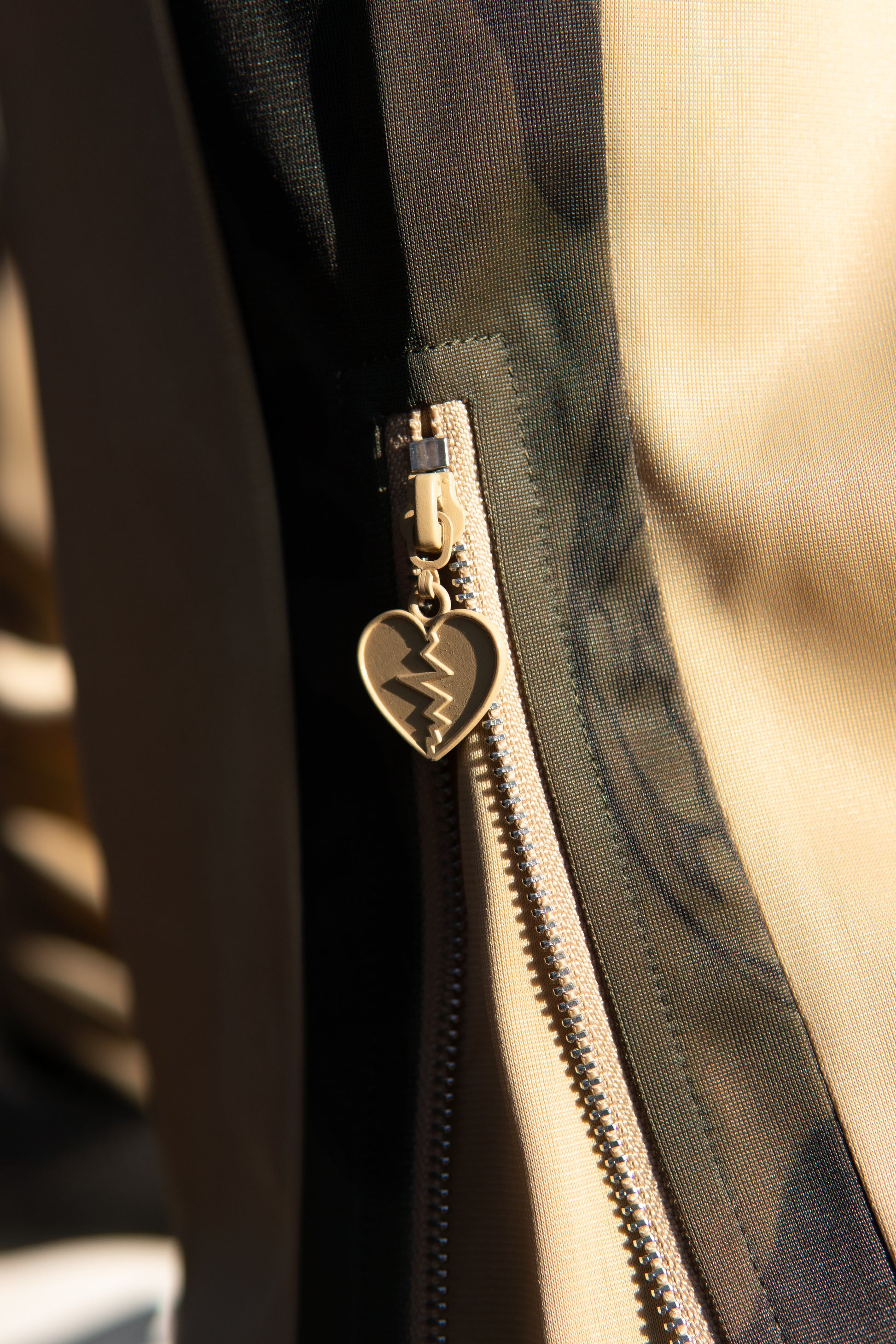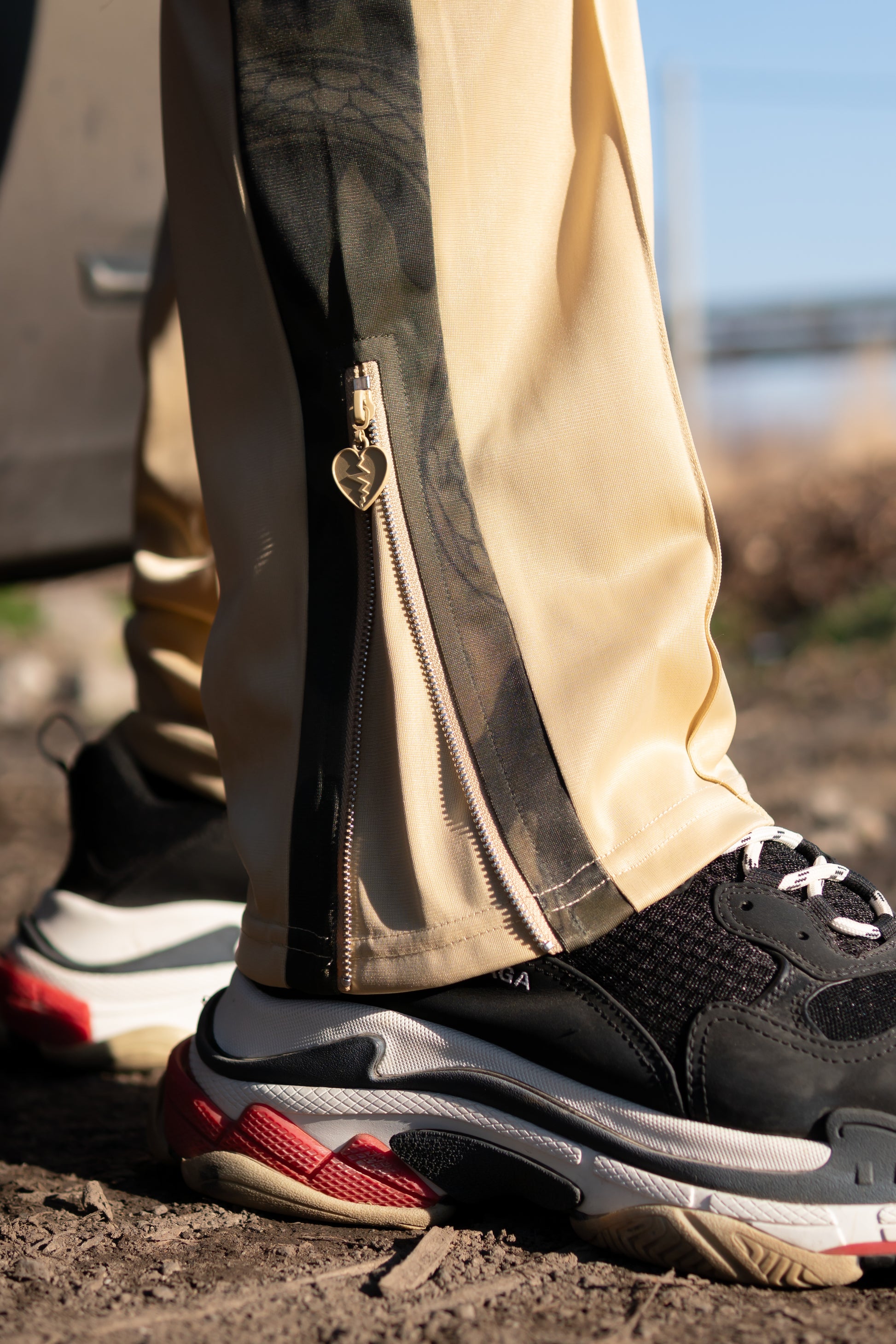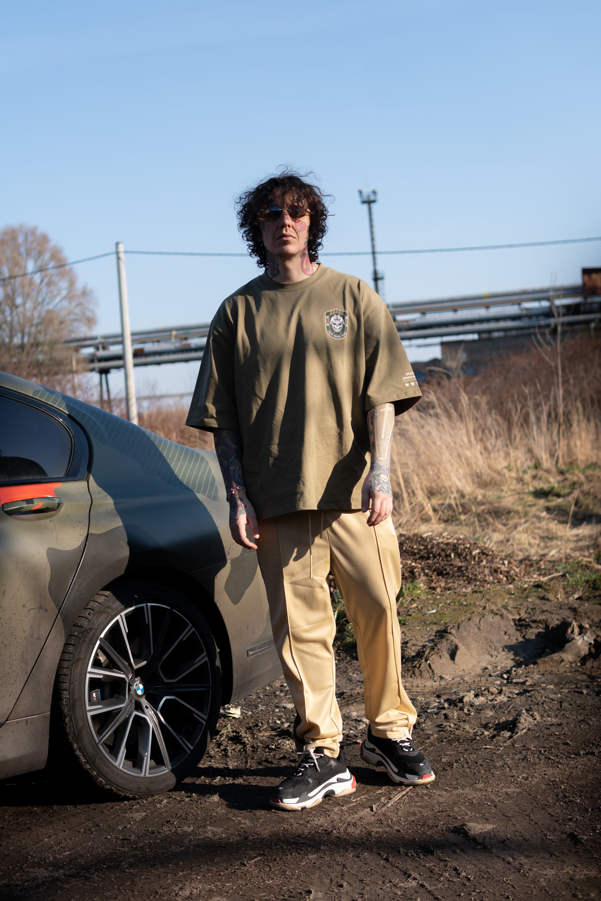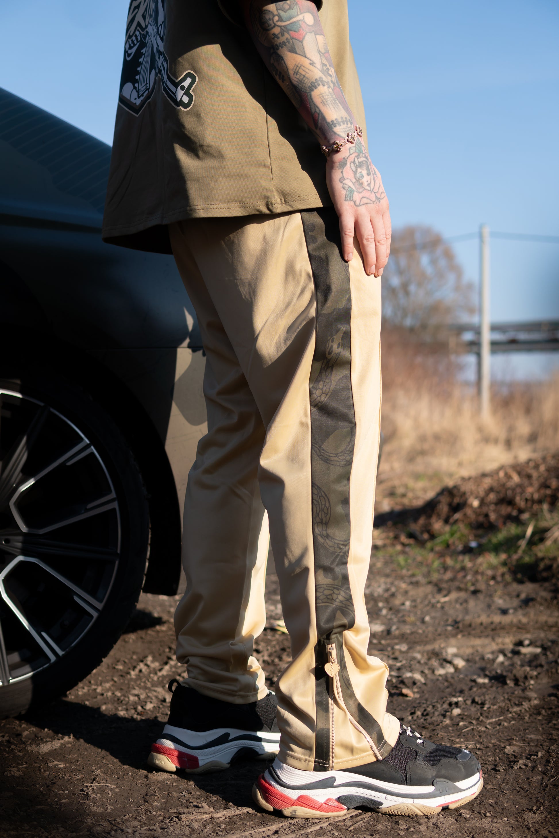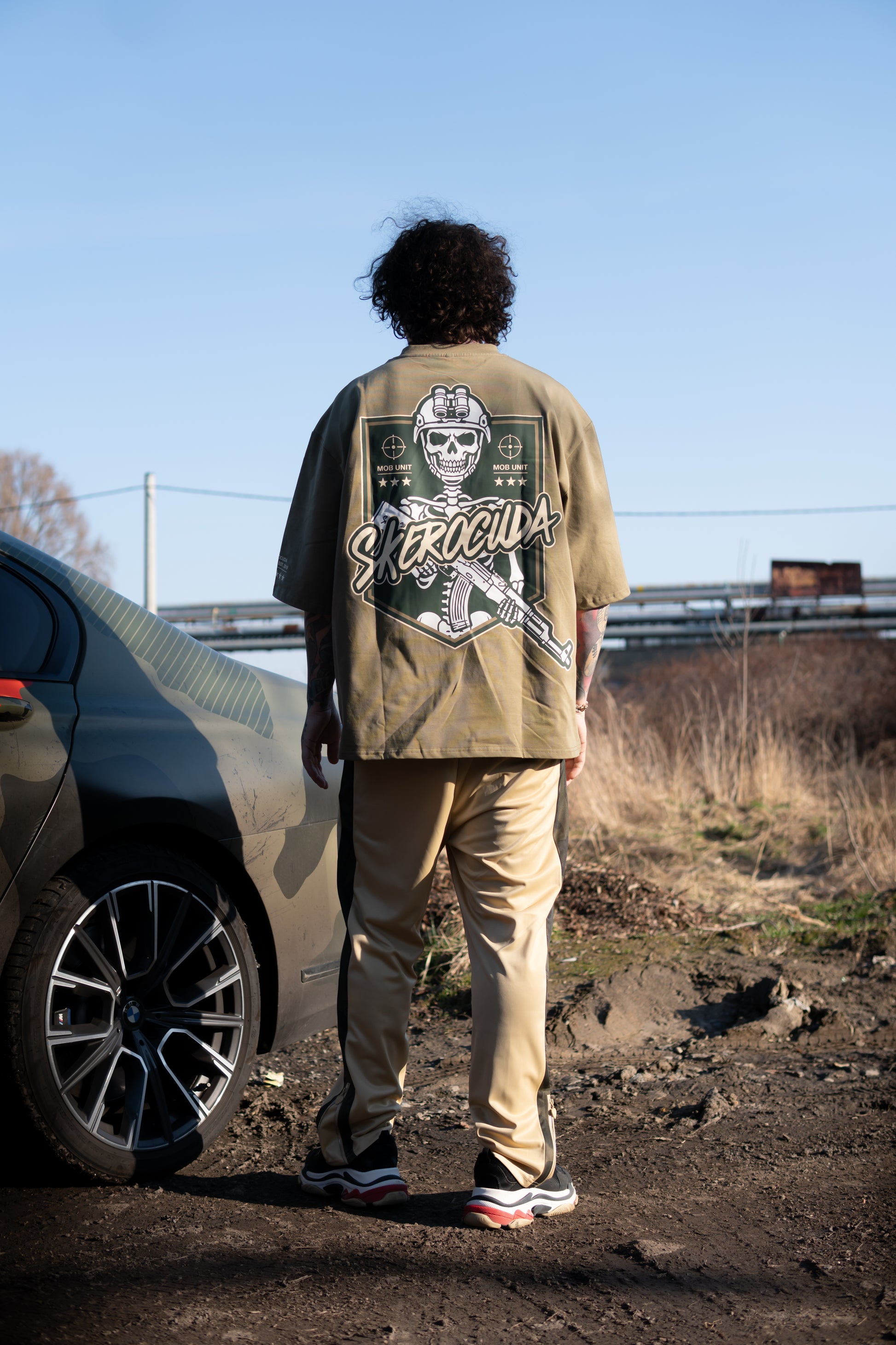 SANDSTORM – limitovaná edice tepláků, které kombinují pohodlný streetwear s výrazným detailem. Béžová / písková základní barva (sand / desert vibe) je doplněná o výrazný boční panel v maskáčovém vzoru (military camo s drakem / hadem / oriental motivem). Boční zipy u kotníků s kovovými detaily umožňují snadné nazouvání i přes boty a dodávají moderní tech-street look. Elastický pas s šňůrkou, praktické kapsy, zadní nášivková kapsa. Logo SKEROCUDA decentně na noze. Materiál příjemný, lehce prošívaný, ideální na všechna roční období.